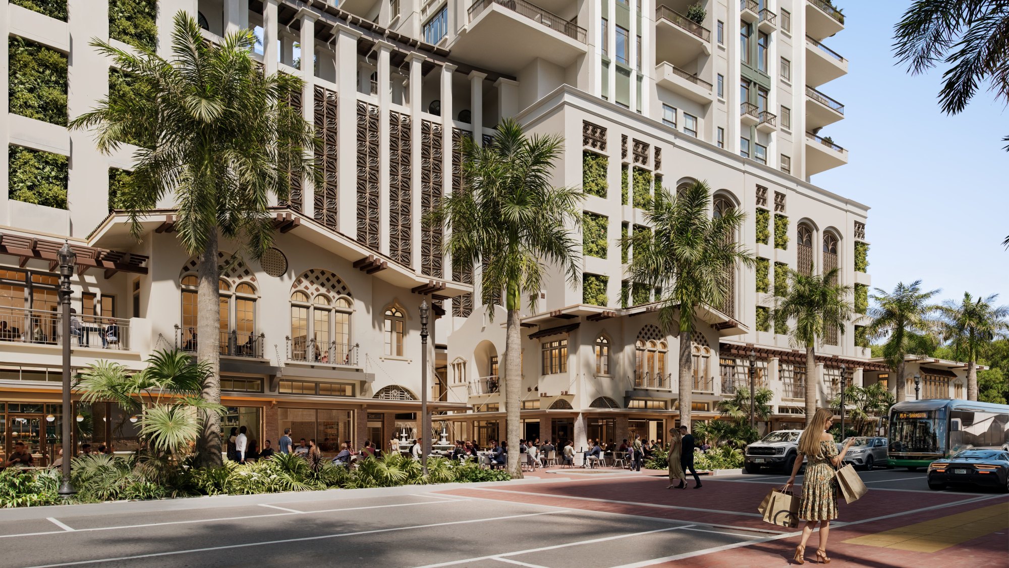 Behind the restored frontage, the development introduces two 18-story condominium towers with approximately 70 estate-style residences designed to capture views of Sarasota Bay and the city skyline. The project also includes a full suite of amenities such as rooftop social spaces, a fitness and wellness center, and landscaped gathering areas, creating a high-end residential experience integrated with an active urban streetscape.